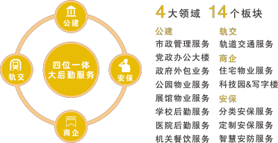 DB真人旗舰DB战略推进“大物业”“大后勤”服务,深度融入“大格局”,构建公建、轨交、商企、安保“四位一体、大后勤服务”的多业态协同战略。业务涉及:市政管理、党政办公大楼、政府外包业务、公园、展馆、学校、医院、机关食堂,以及轨道交通、住宅物业、科技园区、写字楼、安保服务等诸多领域,为美好生活给予一站式大后勤服务保障。