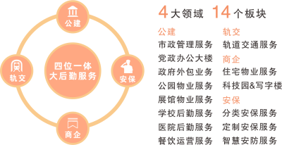 DB真人旗舰DB战略推进“大物业”“大后勤”服务,深度融入“大格局”,构建公建、轨交、商企、安保“四位一体、大后勤服务”的多业态协同战略。业务涉及:市政管理、党政办公大楼、政府外包业务、公园、展馆、学校、医院、机关食堂,以及轨道交通、住宅物业、科技园区、写字楼、安保服务等诸多领域,为美好生活给予一站式大后勤服务保障。